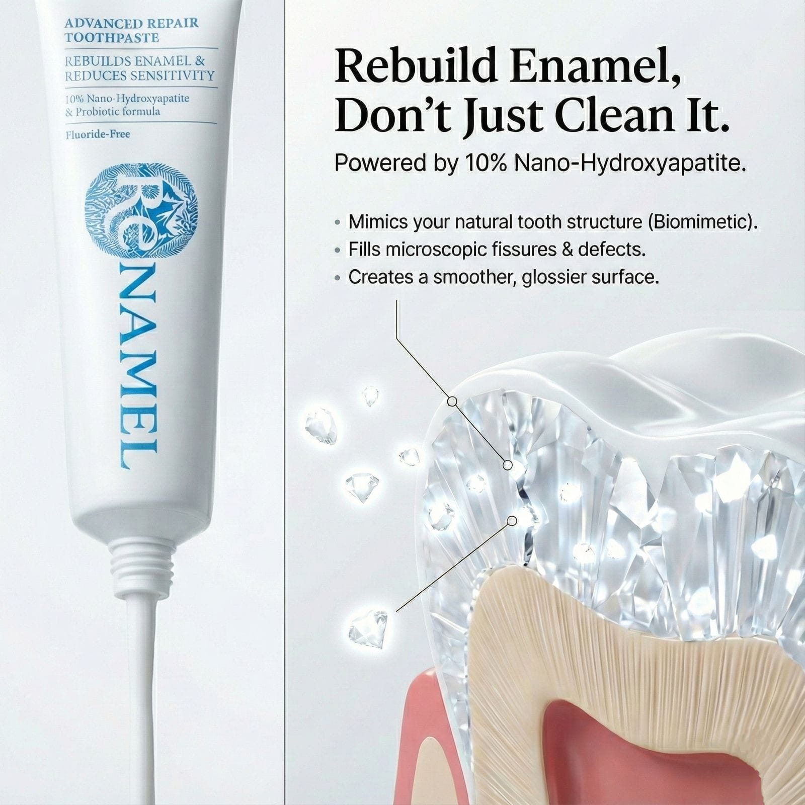 Imagine if you could give your teeth the exact same mineral they're naturally made of. That's what Renamel® does with 10% nano‑hydroxyapatite—the precise building block of healthy enamel.